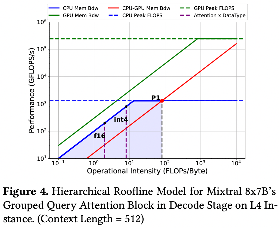 Attention: 以上图为例,GQA-Mixtral(所有 KV cache 均在 CPU 内存中)来说,CPU-GPU 的异构能达到的计算性能点在 P1,被 CPU-GPU 的 mem bdw 限制住了完全没有发挥 GPU 的计算效果。而 int4 量化 KV cache 的纯 CPU 计算其实已经很接近了 P1,这种情况下与其把 KV cache 挪到 GPU 计算不如用纯 CPU。