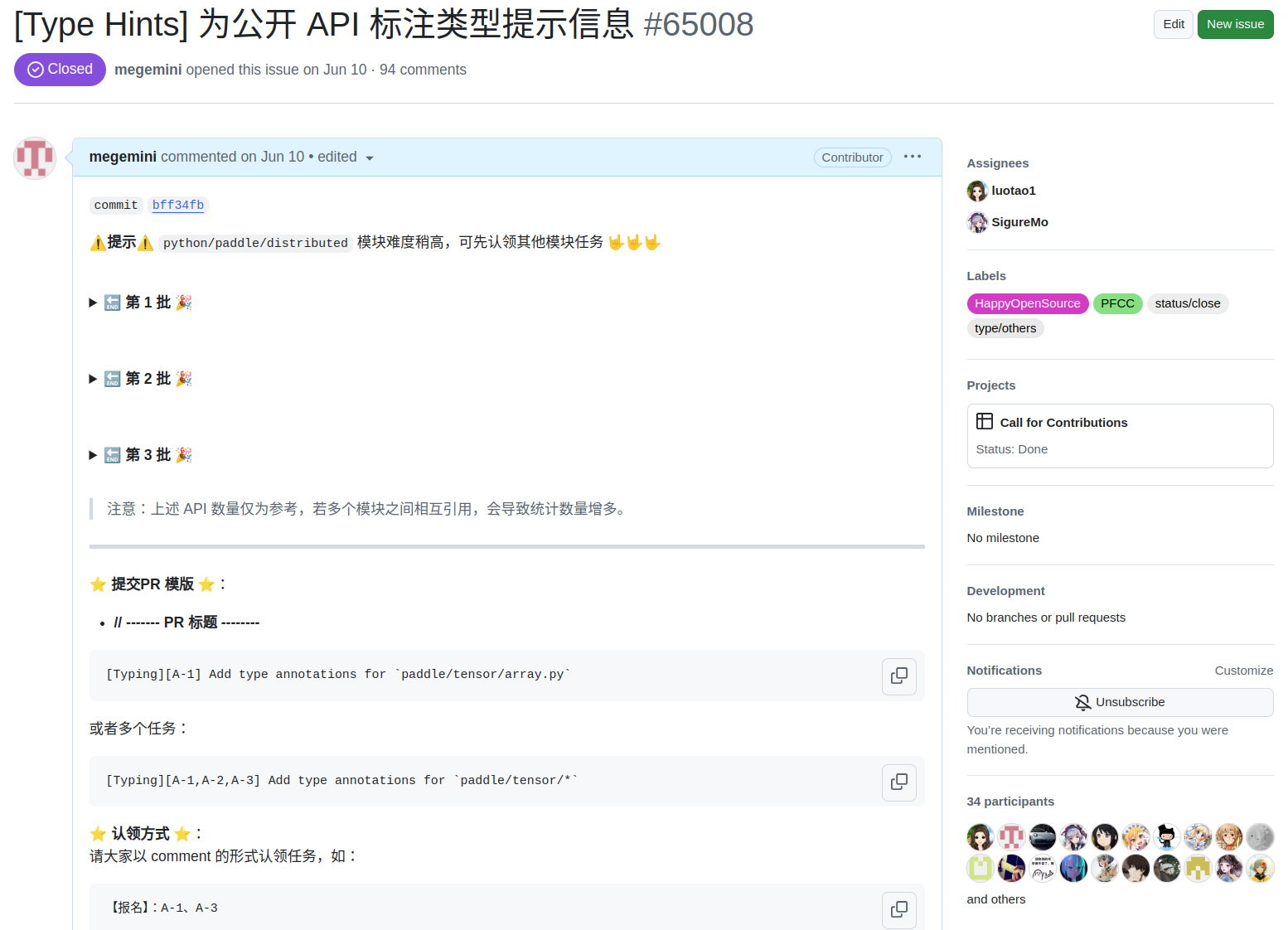借助飞桨的完善的开源社区建设,6 月初,我们开放了 [Type Hints] 为公开 API 标注类型提示信息 这个主体标注任务。任务划分为三批,共 337 个子任务,前后有 30 多位开发者参与,完成了 Paddle 的 2000 多个 API 的类型标注,PR 数量有 300 多个。
